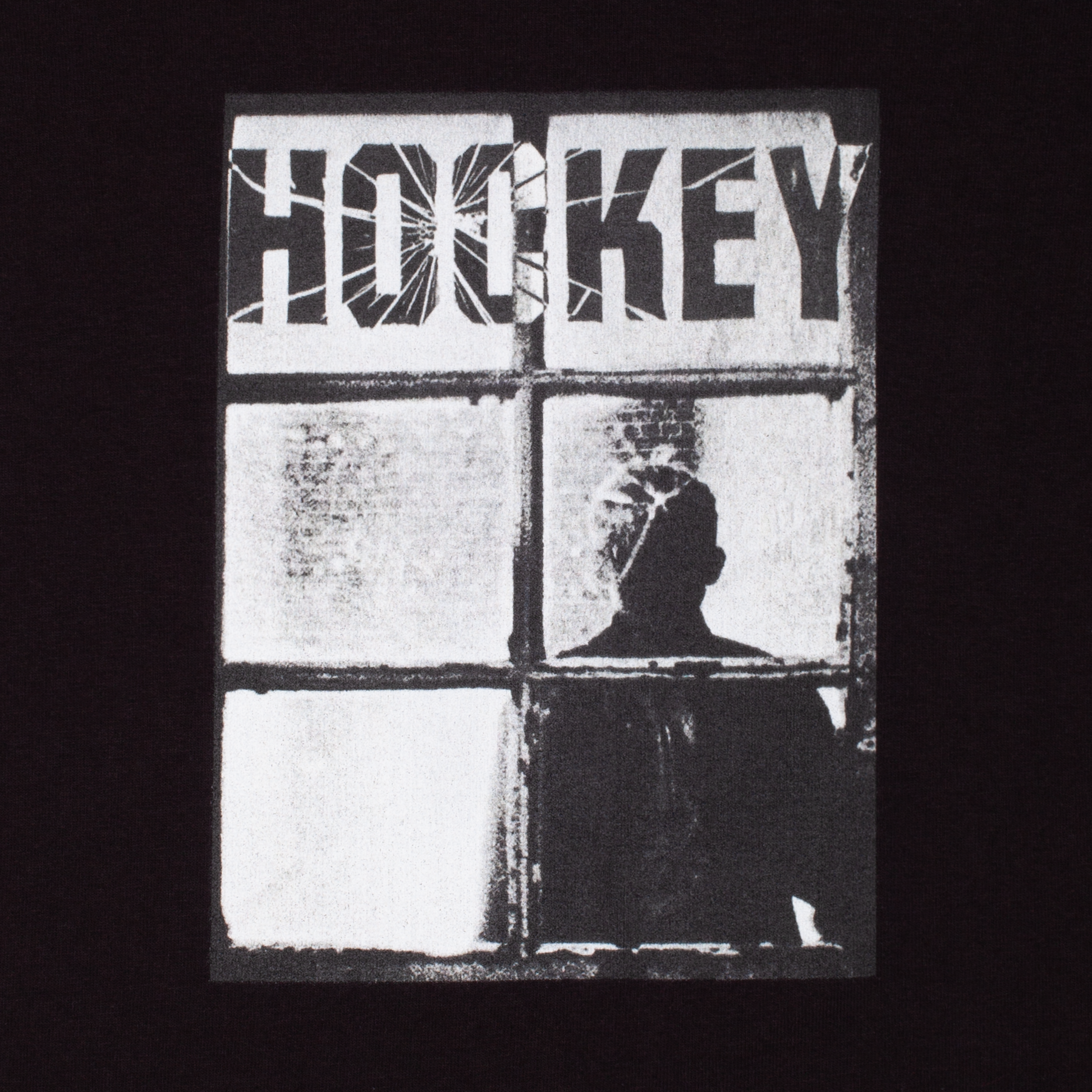 Sobre un fondo negro sólido, la camiseta presenta un gráfico central que parece una fotografía de una película noir o una vieja captura de vigilancia. La imagen, en blanco y negro de alto contraste, muestra una figura sombría detrás de una ventana rota o sucia. El logo de "HOCKEY" está integrado en el cristal de arriba, con un efecto de vidrio roto que subraya la energía desafiante de la marca.