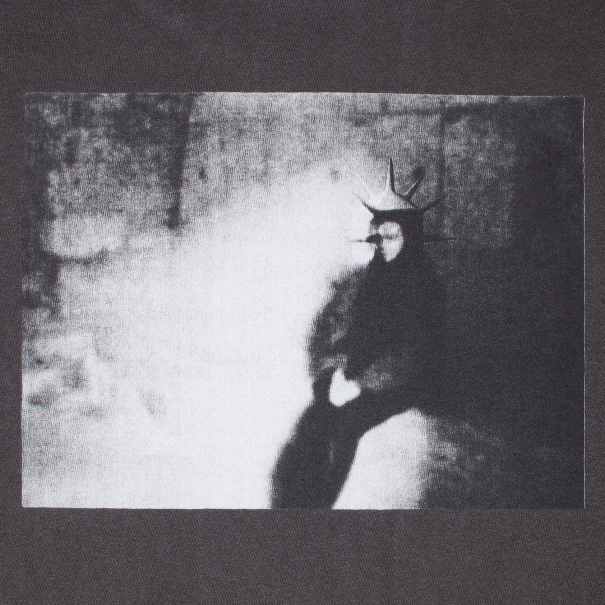 Un gráfico fotográfico en blanco y negro de alto contraste que evoca una silueta demoníaca con cuernos o corona, envuelta en sombras y niebla. Es un diseño que remite a la estética del horror punk y la fotografía underground.