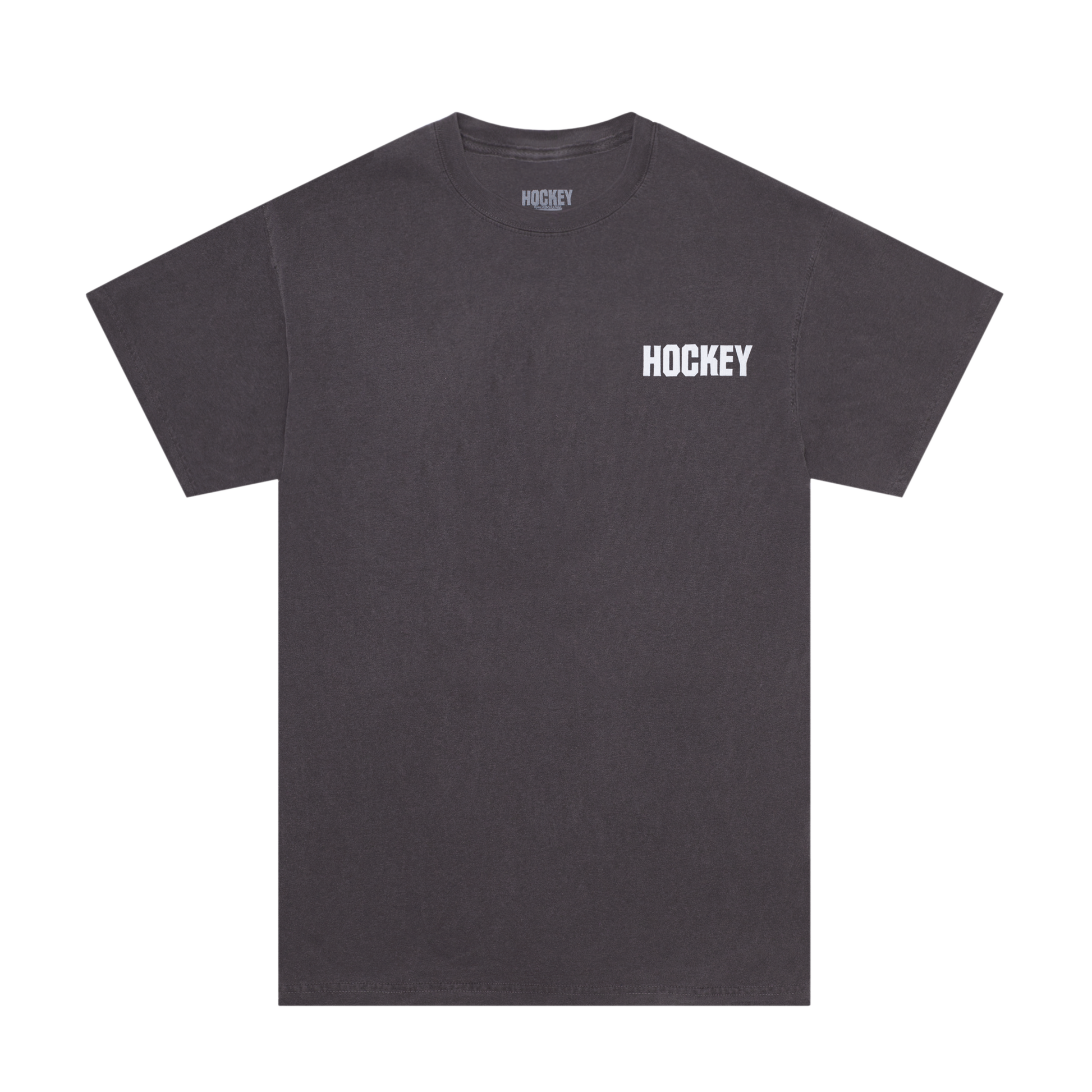 El color es un carbón lavado (Washed Charcoal), dándole esa textura desgastada que se siente y se ve genial. En el pecho, lleva el logo de "HOCKEY" en un font clásico y limpio. Pero el statement está en la espalda: