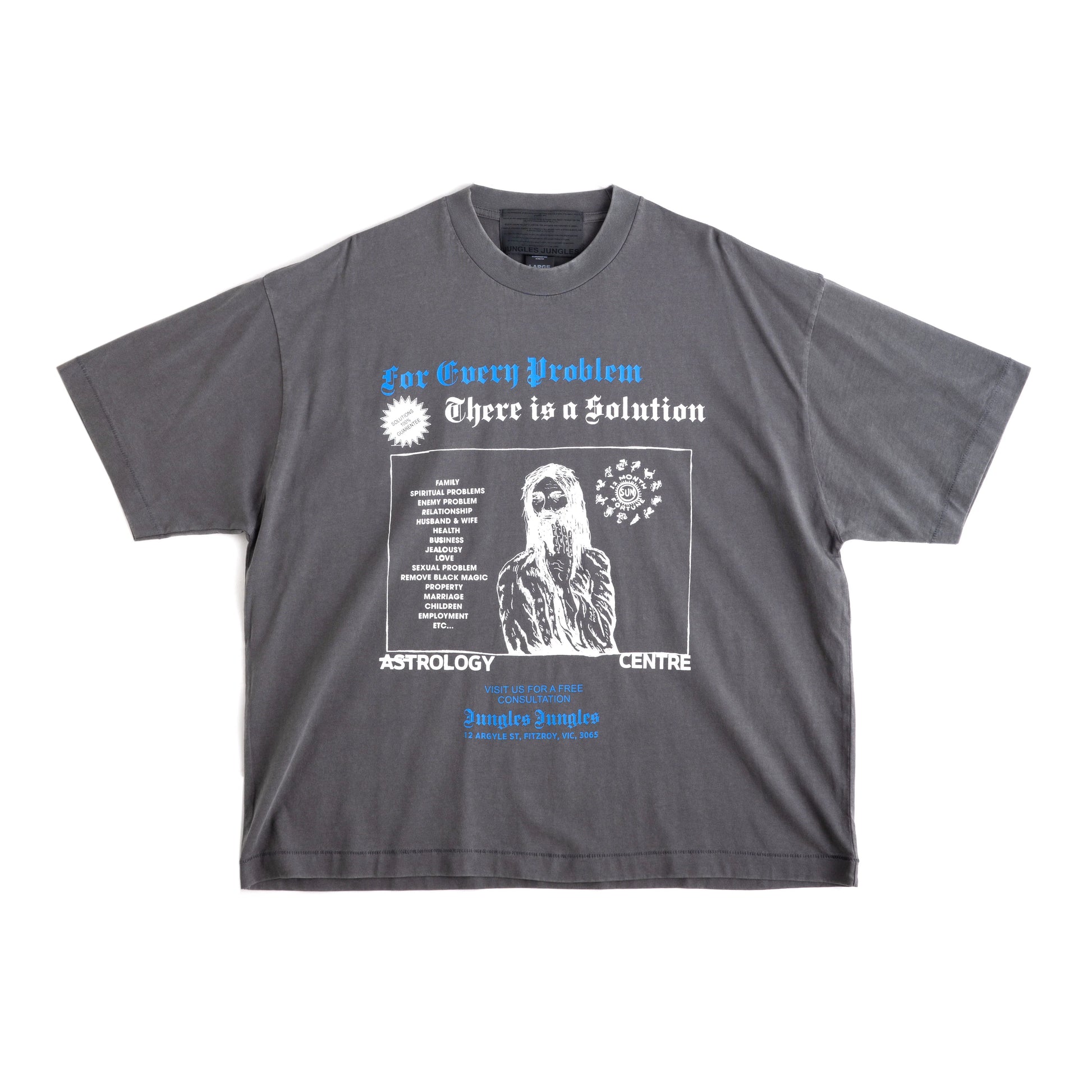 Una pieza vintage y edgy en tono gris carbón, con un diseño que evoca la cartelería de un vidente o astrólogo antiguo. El gráfico frontal es atrevido, con un grabado de estilo místico y una lista de problemas que promete resolver, desde "Sexual Problem" hasta "Remove Black Magic".