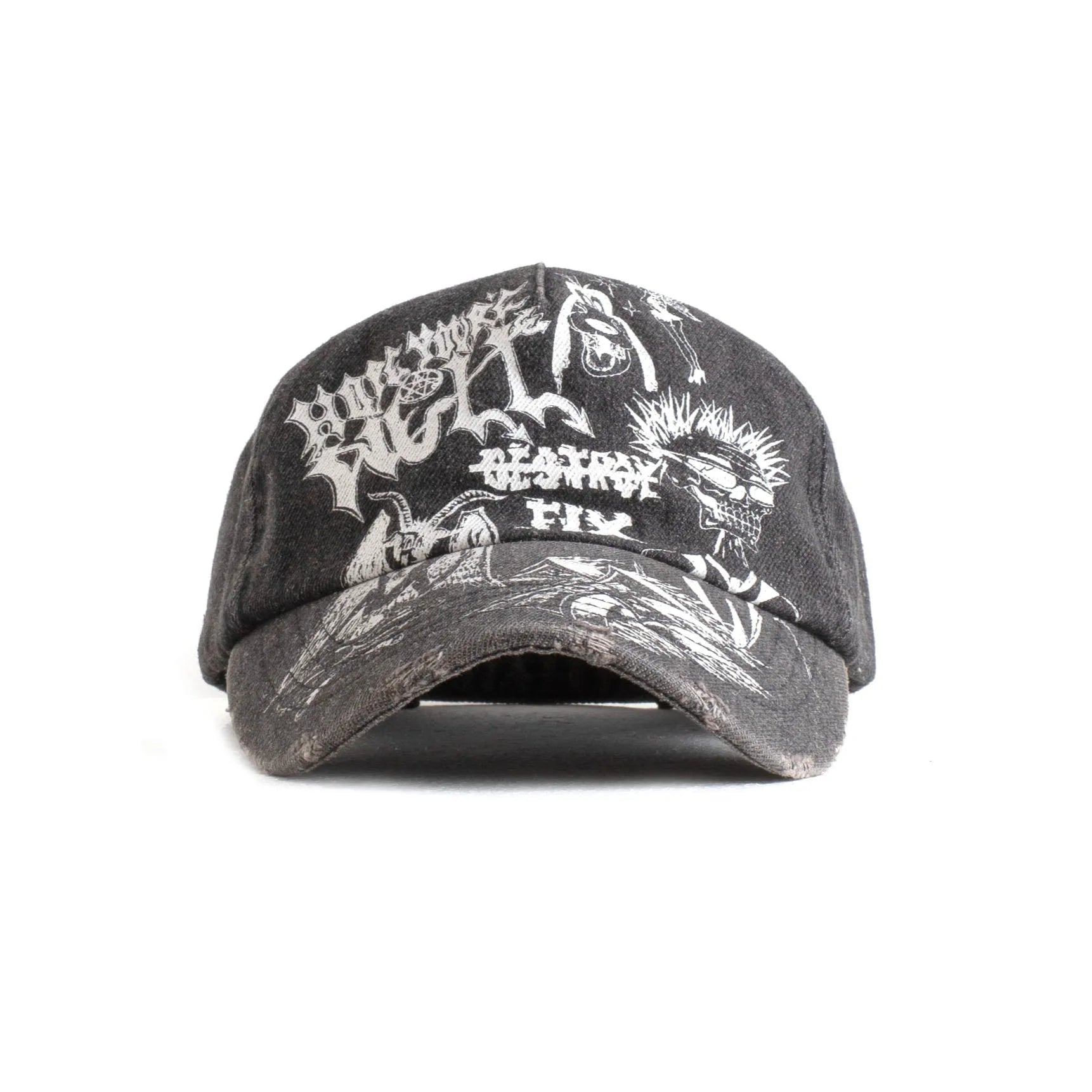 Esta gorra vintage de béisbol, con un lavado desgastado en color gris carbón, es el accesorio definitivo para el espíritu punk. El print en blanco y negro es un collage gráfico que evoca la energía metal y el caos controlado, con sus motivos de Baphomet, un esqueleto punk y el lema "DESTROY FIX" (Destruye, Arregla).