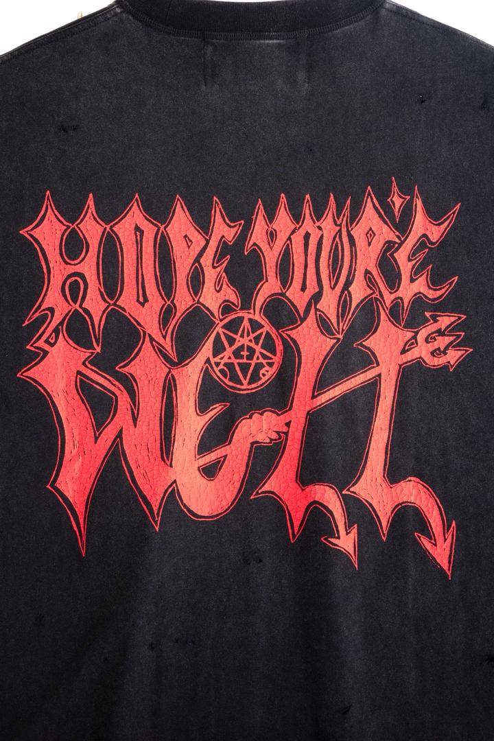 La espalda es lo más arrecho (impresionante): una tipografía death metal gigante y roja con el irónico mensaje "HOPE YOU'RE WELL" (Espero que estés bien), junto a un pentagrama invertido. Esta franela es una declaración de rebeldía y humor negro. Ideal para un estilo grunge oscuro que busca un impacto máximo.