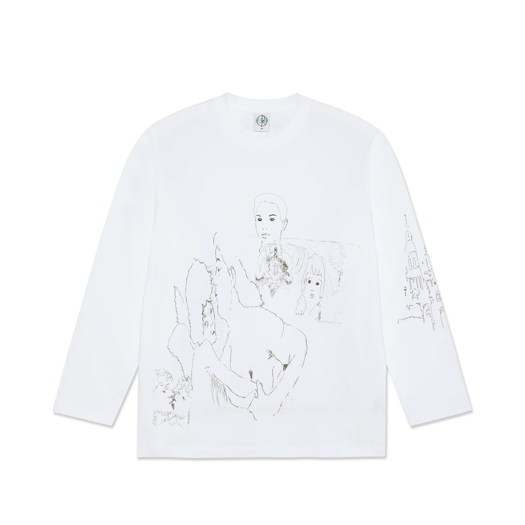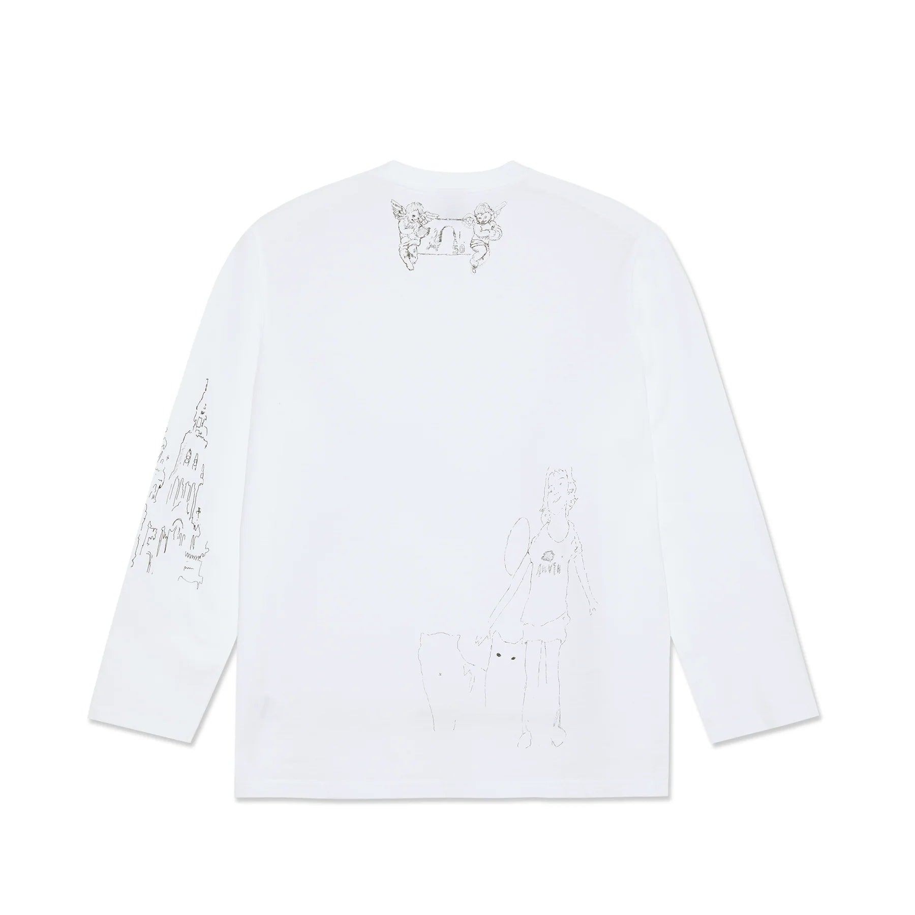 Con ilustraciones tipo doodle en líneas negras por toda la prenda, es para los que les gusta llevar un estilo surrealista y audaz. En el frente, figuras y rostros; en la espalda, más sketches; y en las mangas, estructuras tipo castillo, Es la pieza perfecta para un look alternativo y auténtico.