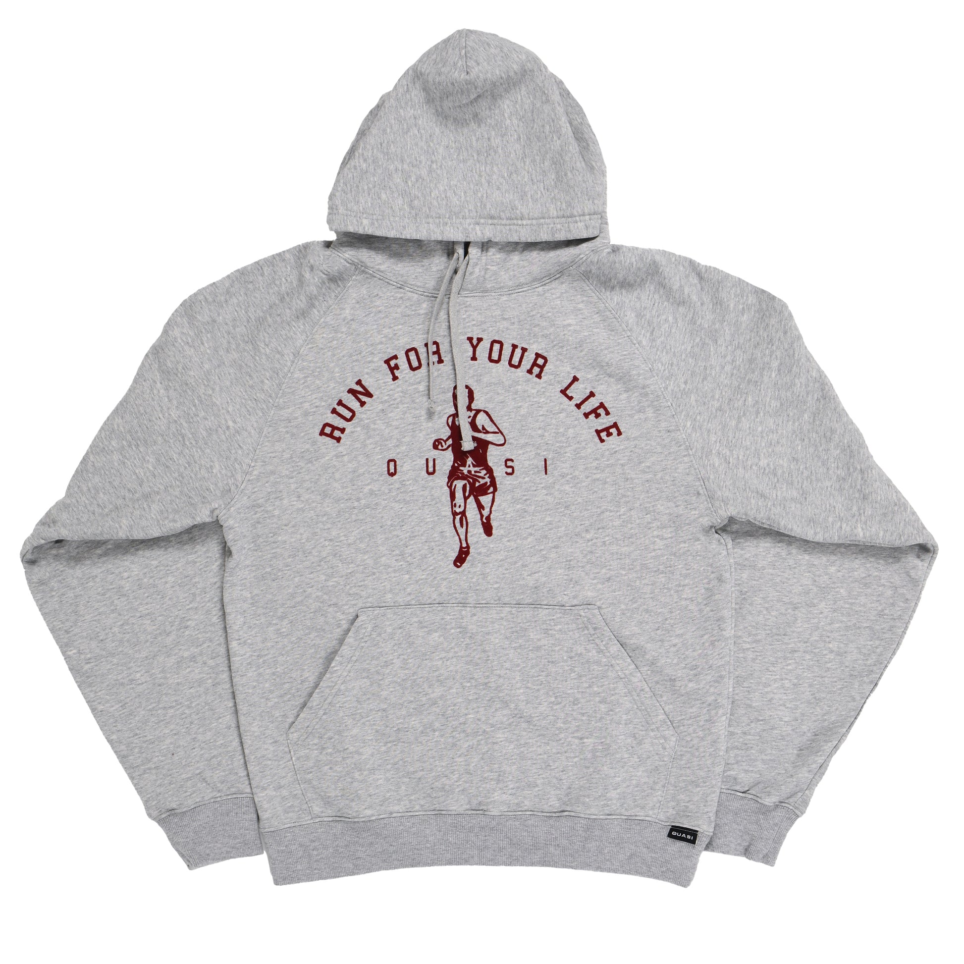 En el frente lleva la frase "RUN FOR YOUR LIFE" sobre un gráfico de un corredor clásico y la marca QUASI discretamente.